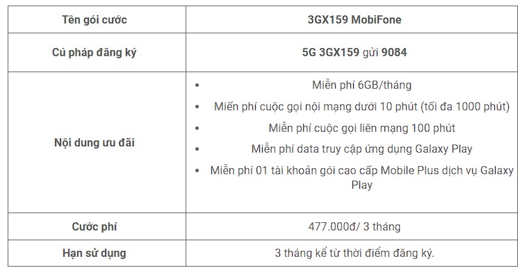 Cú pháp đăng ký 4g mobi gói 3GX159 MobiFone: 5G 3GX159 gửi 9084