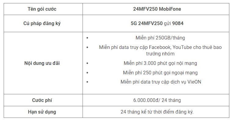 Nếu đăng ký thành công gói mobi 4g 24MFV250 bạn sẽ nhận được ưu đãi sau: