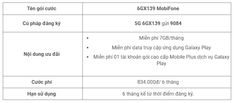 Để đăng ký gói 6GX139 Mobifone và nhận 7GB data cùng nhiều ưu đãi khác chỉ với 834.000đ trong vòng 6 tháng, bạn chỉ cần sử dụng lệnh đăng ký 4G mobi đơn giản dưới đây.