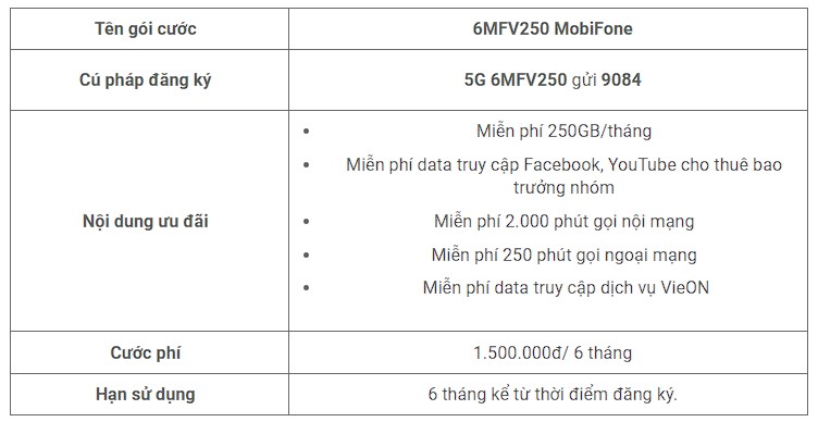 Cú pháp đăng ký 4g mobi 6MFV250 MobiFone: 5G 6MFV250 gửi 9084