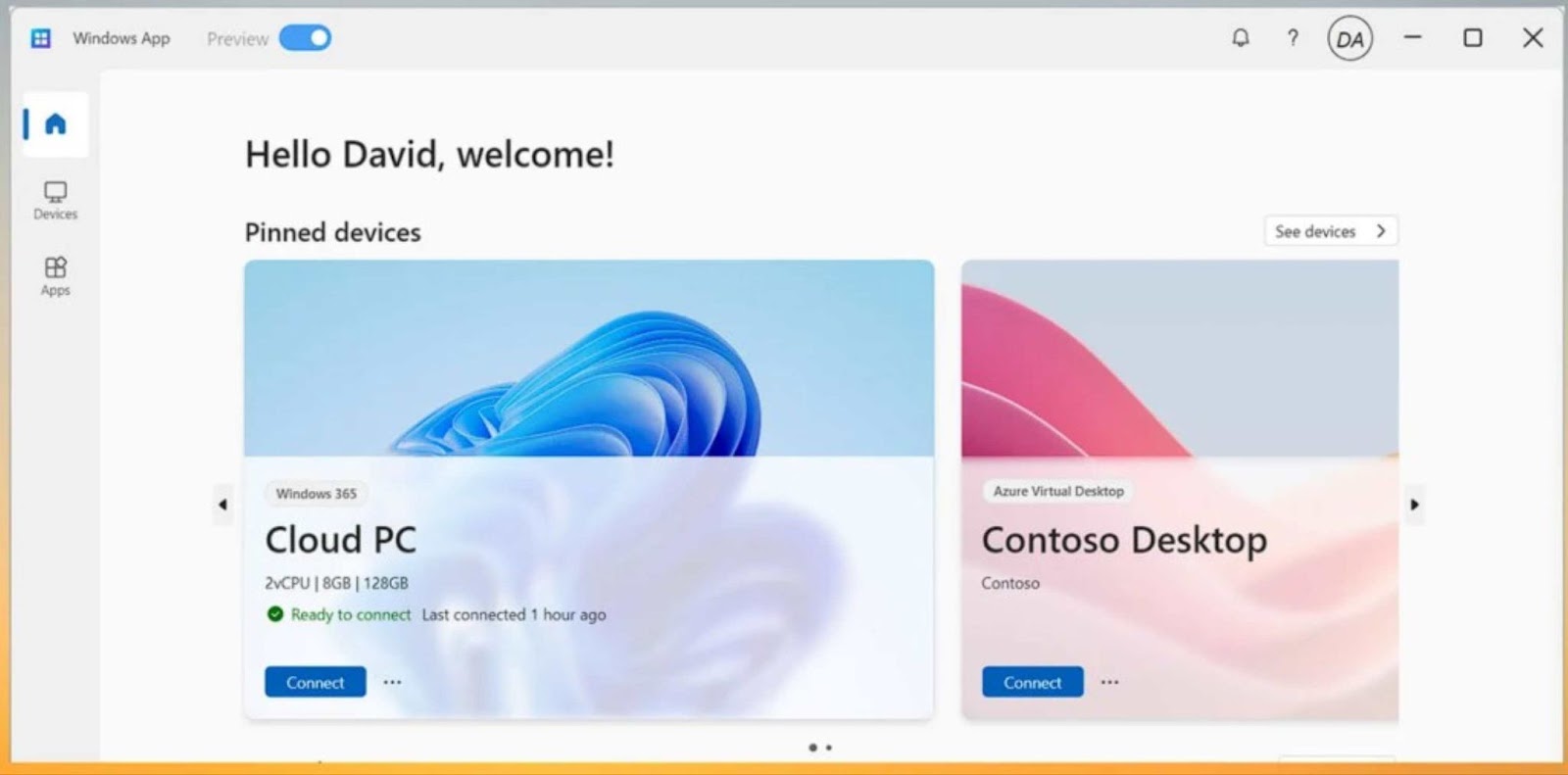 Ứng dụng hiện có sẵn ở dạng xem trước và cho phép bạn liên kết máy tính để bàn Windows 365, máy tính để bàn ảo Azure hoặc máy tính để bàn Microsoft Dev Box.